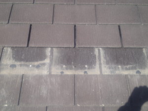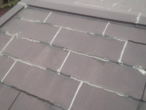 雨漏り修理の依頼で屋根をチェック! 台風補強で瓦同士をコーキングで補強されていたようですが、この写真のように隙間なくコーキングを塗ると、逆に毛細管現象で雨が浸水し瓦の隙間がないので蒸れて屋根野地板が腐れて雨漏りになります